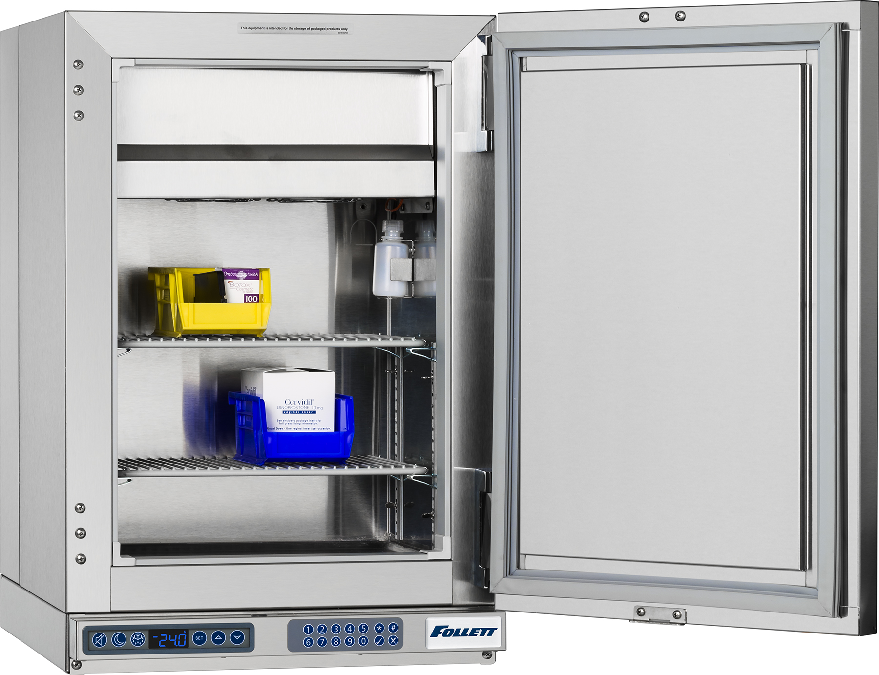 Congelador de encimera de grado médico. Controlador de temperatura con microprocesador con punto de ajuste de refrigeración ajustable que proporciona un control preciso. Sistema de refrigeración por aire forzado. Rango de Temperatura (proglamable) de -28 a -18 °C. Refrigerante R404a no-CFC. Alarmas audibles y visuales de temperatura alta/baja y de puerta entreabierta programables por el usuario. Certificado para cumplir con el estándar NSF 456 para el almacenamiento de vacunas