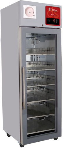 Refrigerador vertical para Banco de Sangre, de acero inoxidable. Puerta de vidrio. Refrigerante R290. Con ruedas, cierre de puerta y luz led interna. LCD con Controller Evco EVJ206.