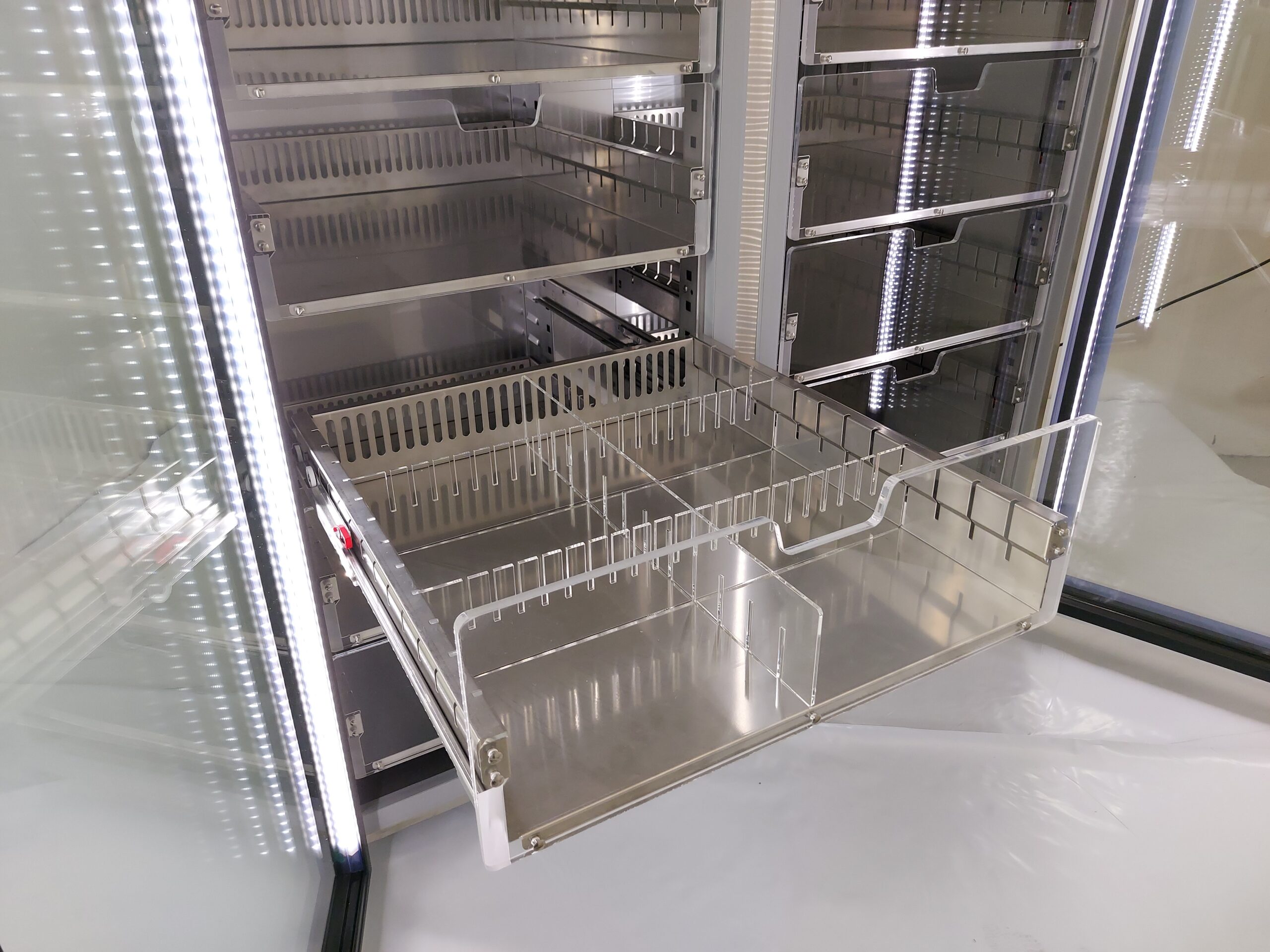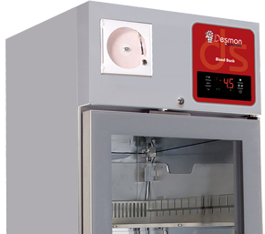 Refrigerador vertical para Banco de Sangre, de acero inoxidable. Dos puertas de vidrio. Refrigerante R290. Con ruedas, cierre de puerta y luz led interna. LCD con Controller Evco EVJ206.